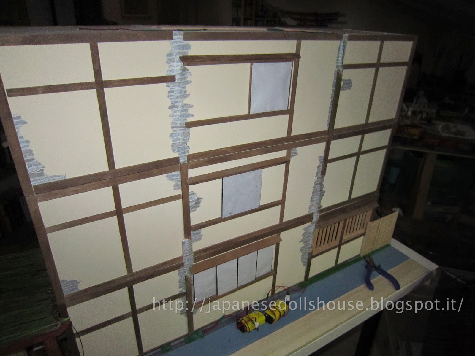 So here’s the deal.  When I started the inn, I had an idea that it would be for young people, a bit bohemian.  Not five star class if you get my drift.  I even had an original idea to make it a Japanese bordello...course, as I got into it I could see that it really could be something nicer instead of cheap.  Still, the ryokan, from the start, is a little old and not very well kept.  I chose not to varnish most of the embellishments on the walls and to keep areas unfinished a bit.  My choice was two fold: first I knew I was going to run into problems in the construction (both for my inexpertise and the fact that many of the pieces were badly warped to start with) so I knew the rooms and whole house would have gaps or fit together imprecisely and second, it was my first dollhouse.  There was no way I was going to do justice to a beautiful five star ryokan.  So, my inn is for everyone.  The young the old the hippie....all are welcome! Which brings me to the back of the house.